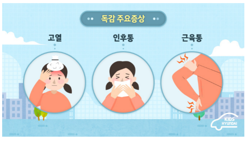 - 독감 증상 : 고열, 두통, 기침, 오한, 근육통, 인후통, 피로감 등이 나타납니다.