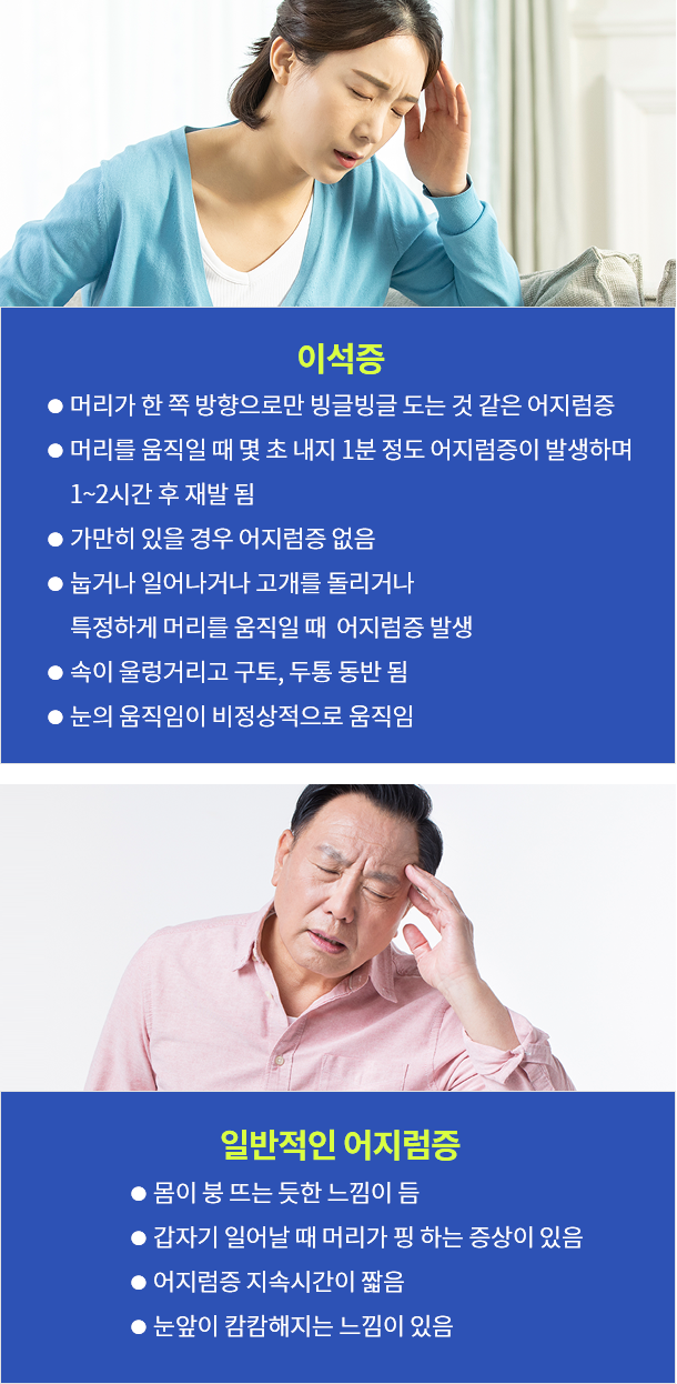 이는 균형을 담당하는 이석이 제 위치에 있지 않고 떨어져 나와 흔들리면서, 신경을 자극하게 되고 균형 잘 잡지 못하고 평형감각을 상실해버리게 되기 때문에 어지럼증과 균형감각 상실 등의 대표 증상과 더불어 구토, 식은땀이 동반됩니다.